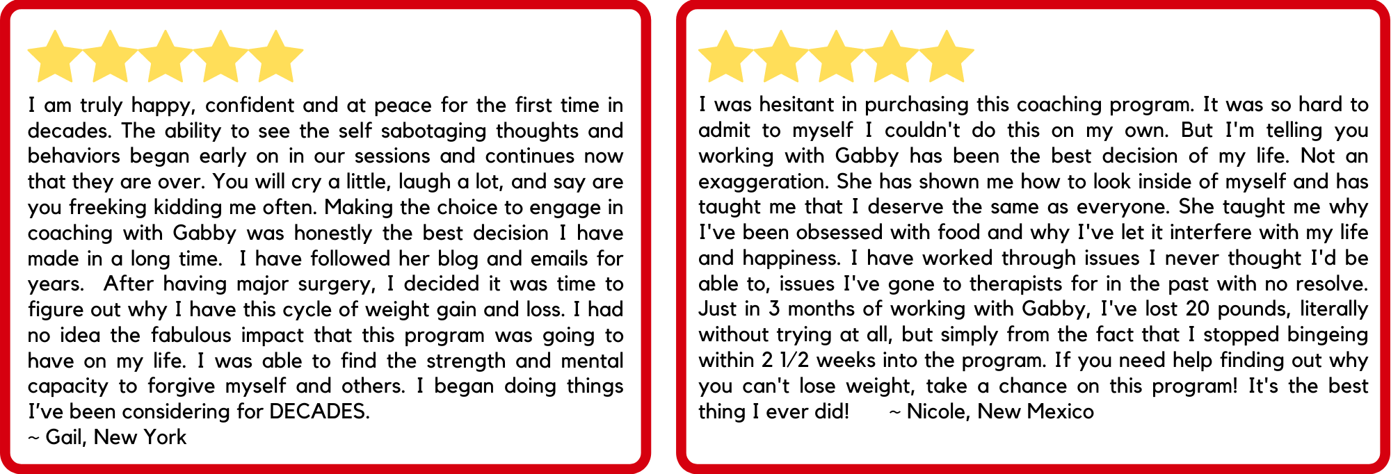 This is because in this program we tackle head on: food issues, bingeing, and complusive overeating. Once healing begins and the client finds the true reason why they're overeating, bingeing, and turning to food to escape their emotions, they no longer have that compulsion because they find healthy ways to cope with and process their emotions. Once the root of the problem is unearthed, the need to run to food disappears, hence the drastic reduction in calorie consumption which causes the weight loss. (These results of course vary person to person)