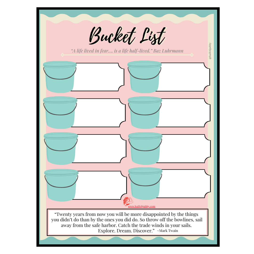This Bucket List printable is exclusively available when you purchase my Self Care Workbook ; however, today I am gifting it to you. Please enjoy this gift for your personal use and do not share, copy, alter, publish, or sell this printable. © Half of Gabby LLC