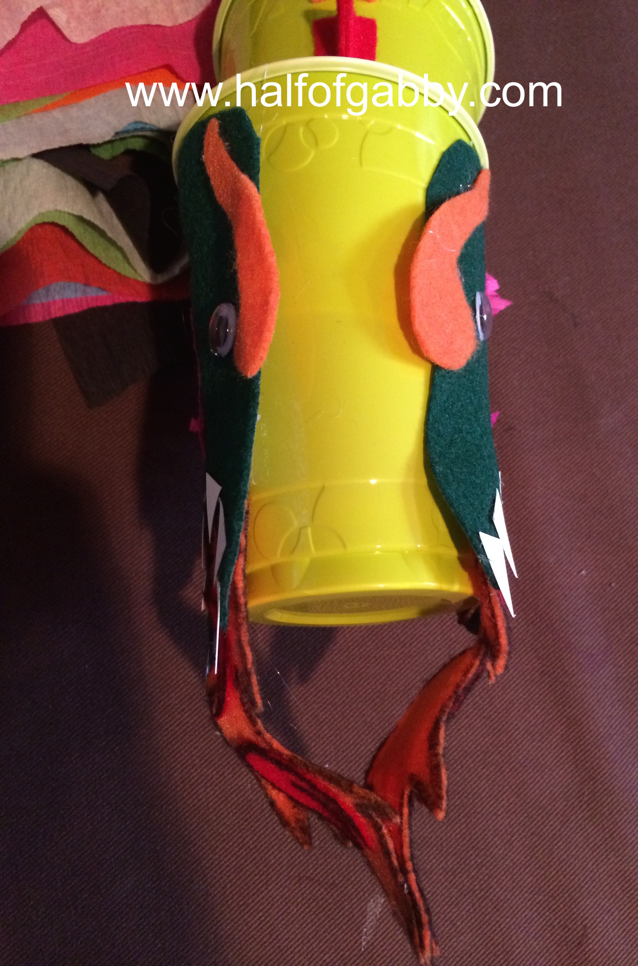 DON'T hot glue the head to the very first cup UNTIL you have hot glued the flames. You will be gluing the flames underneath the head where the mouth opening is.