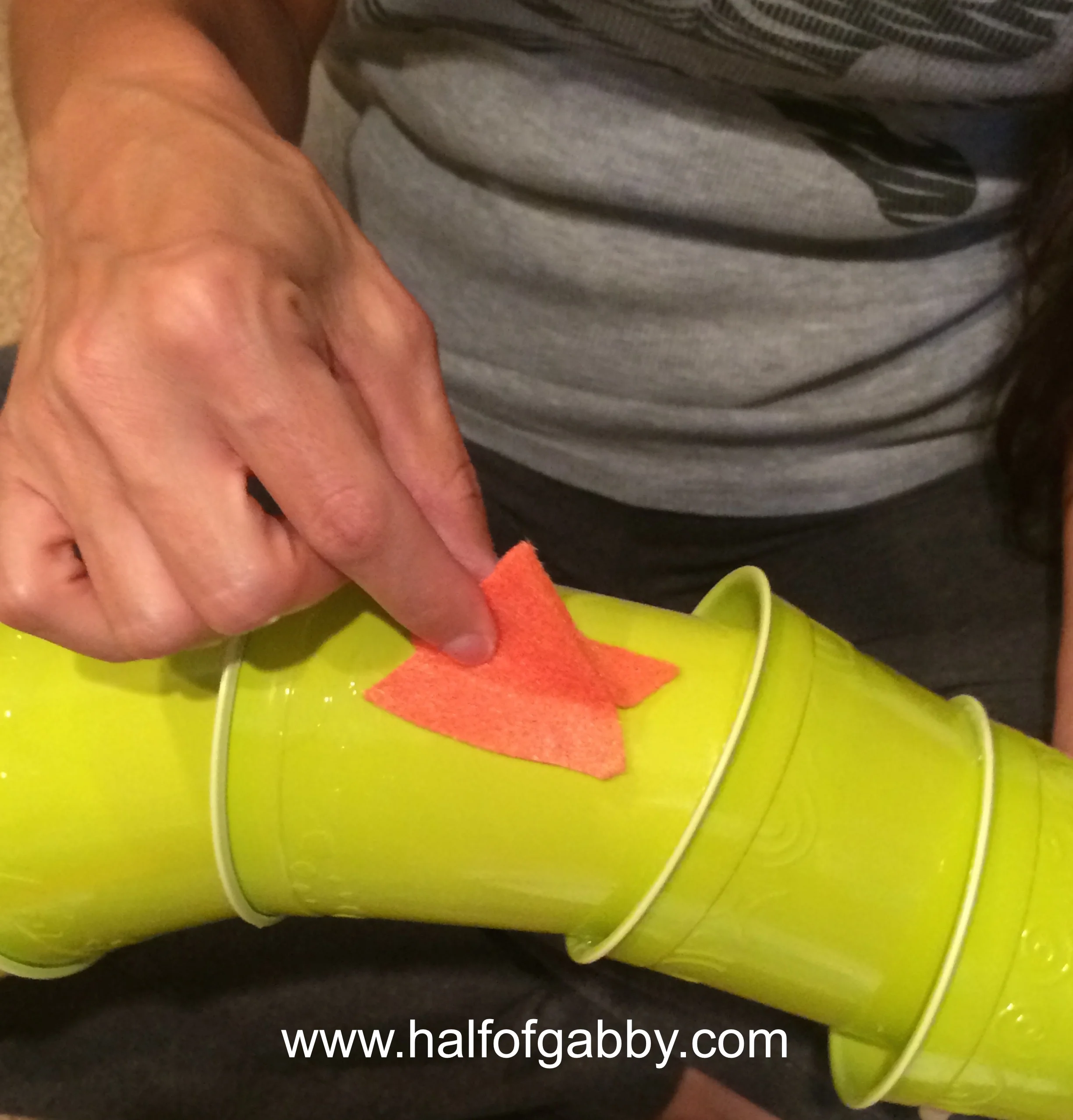 It takes a good while to hot glue all of the plastic cups. If you're still doing that at this point, your child can be cutting the felt shapes out and outlining the flames while you're finishing up the dragon's body.