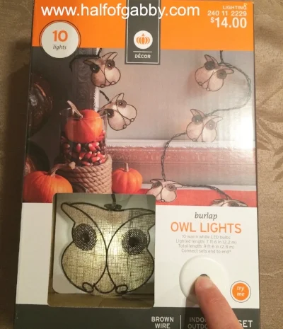 I found these adorable burlap owl lights at Target. If you like owls, you'll love these little guys. I'm waiting until after Halloween to put mine up. Right now my house looks like a Halloween explosion went off. I don't want them to get lost in the sea of ghosts and goblins. I want them to shine all on their own.