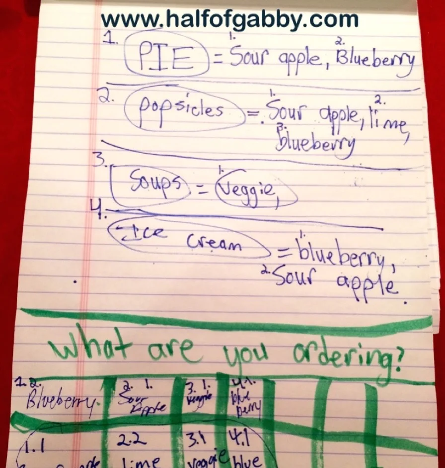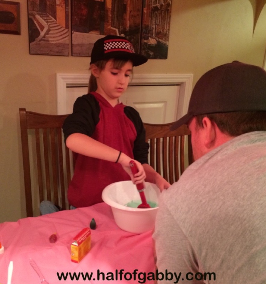We were all enthralled. The neatest thing ever. Science, baby! Gotta love it. The Borax bonds all of the molecules of the separate ingredients into one solid (and stretchy) mass. We were all diggin' this experiment big time. The best part is that after the experiment is over, you have super cool Gak to play with. My 7 year old has not stopped playing with it. She has made her mommy, daddy, and sissy countless restaurant items. LOL! She even has a menu that we order from!