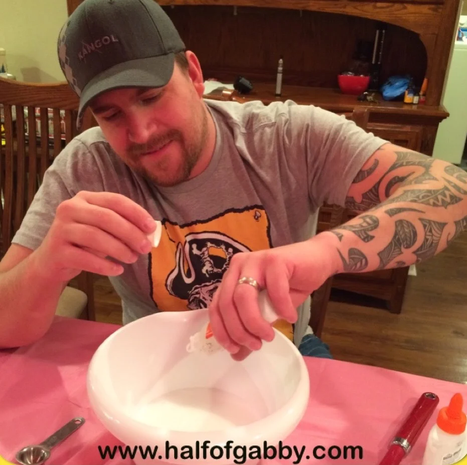 6. Slowly add the Borax water to your glue mixture, in two or three pours.