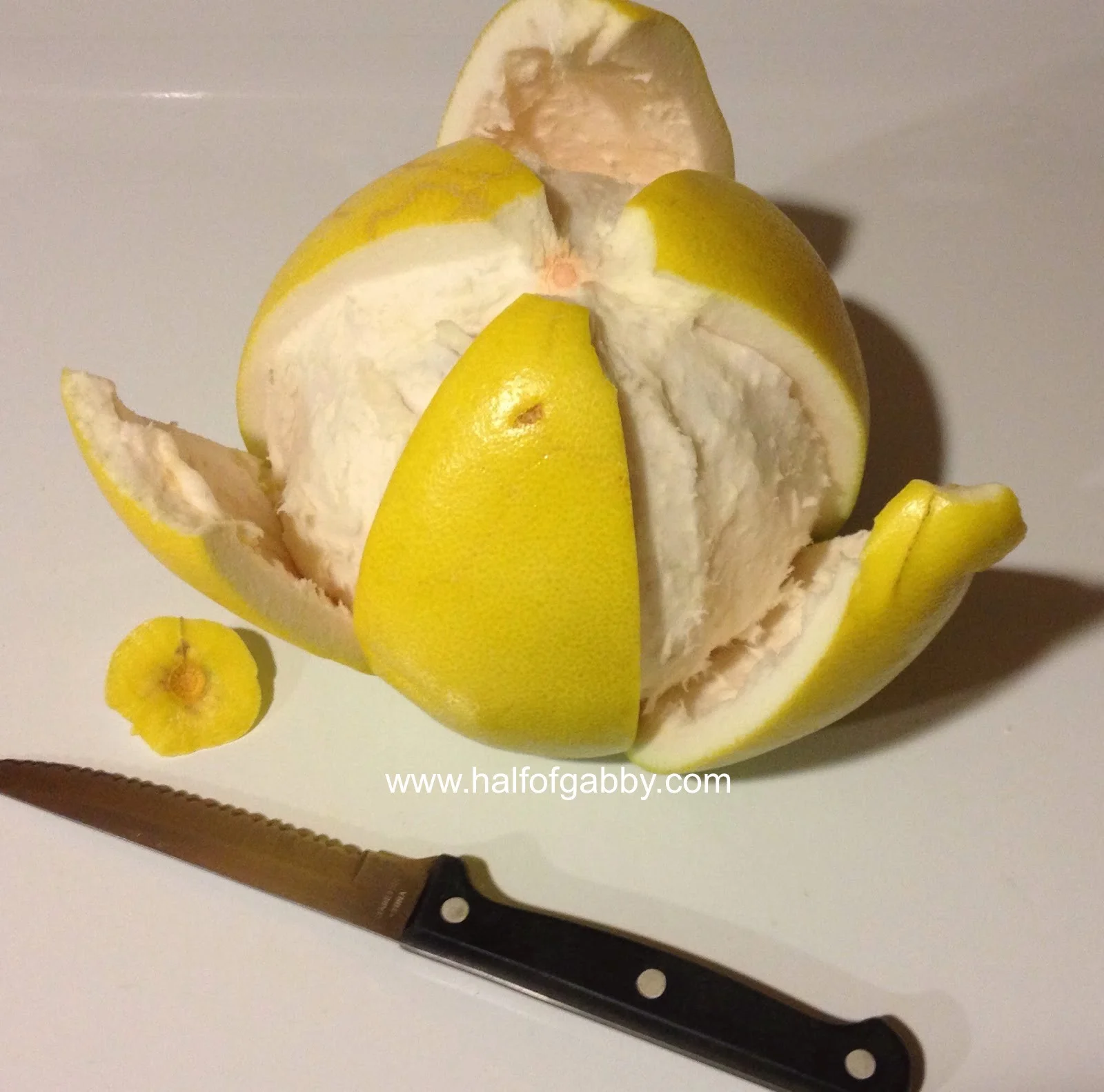 I thought it would be a good idea to give you a pictorial tutorial on how to peel a pummelo. I've had a couple friends that have called me after trying a pummelo (because I tell everyone to try them) and they said they couldn't eat them because the skin was too thick. They only took the peel and first layer of skin off. You must take the second skin off as well. You have to remove every bit of the skin. It’s not like an orange where you peel it and then eat the pieces. You have to get down to the raw flesh of the fruit.