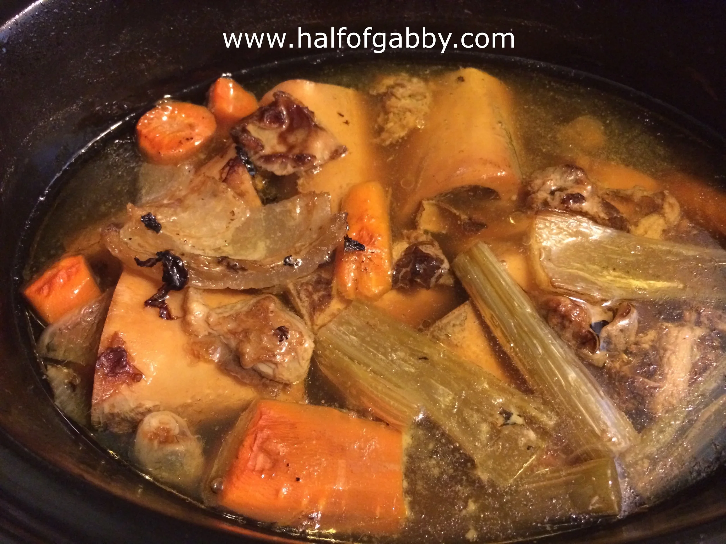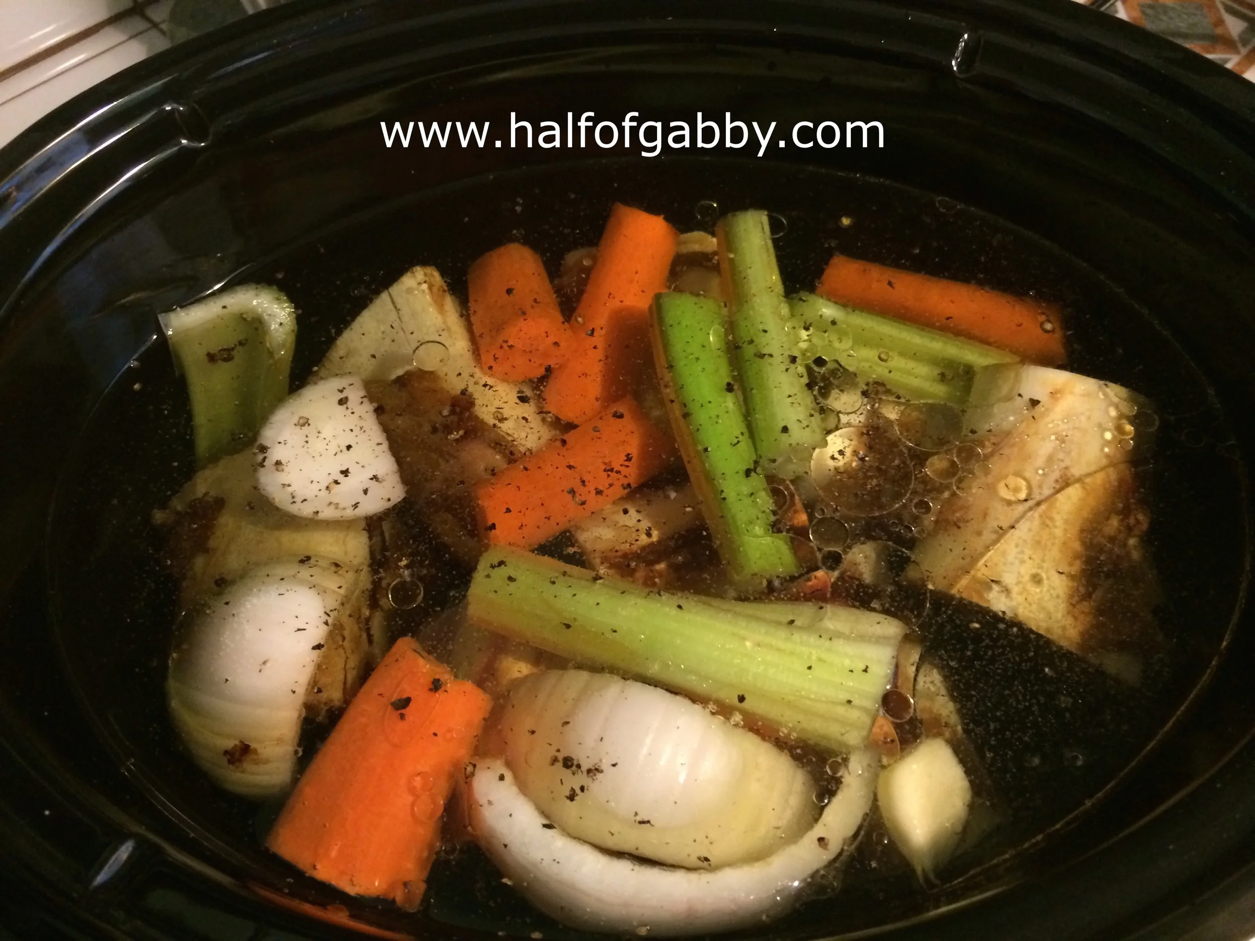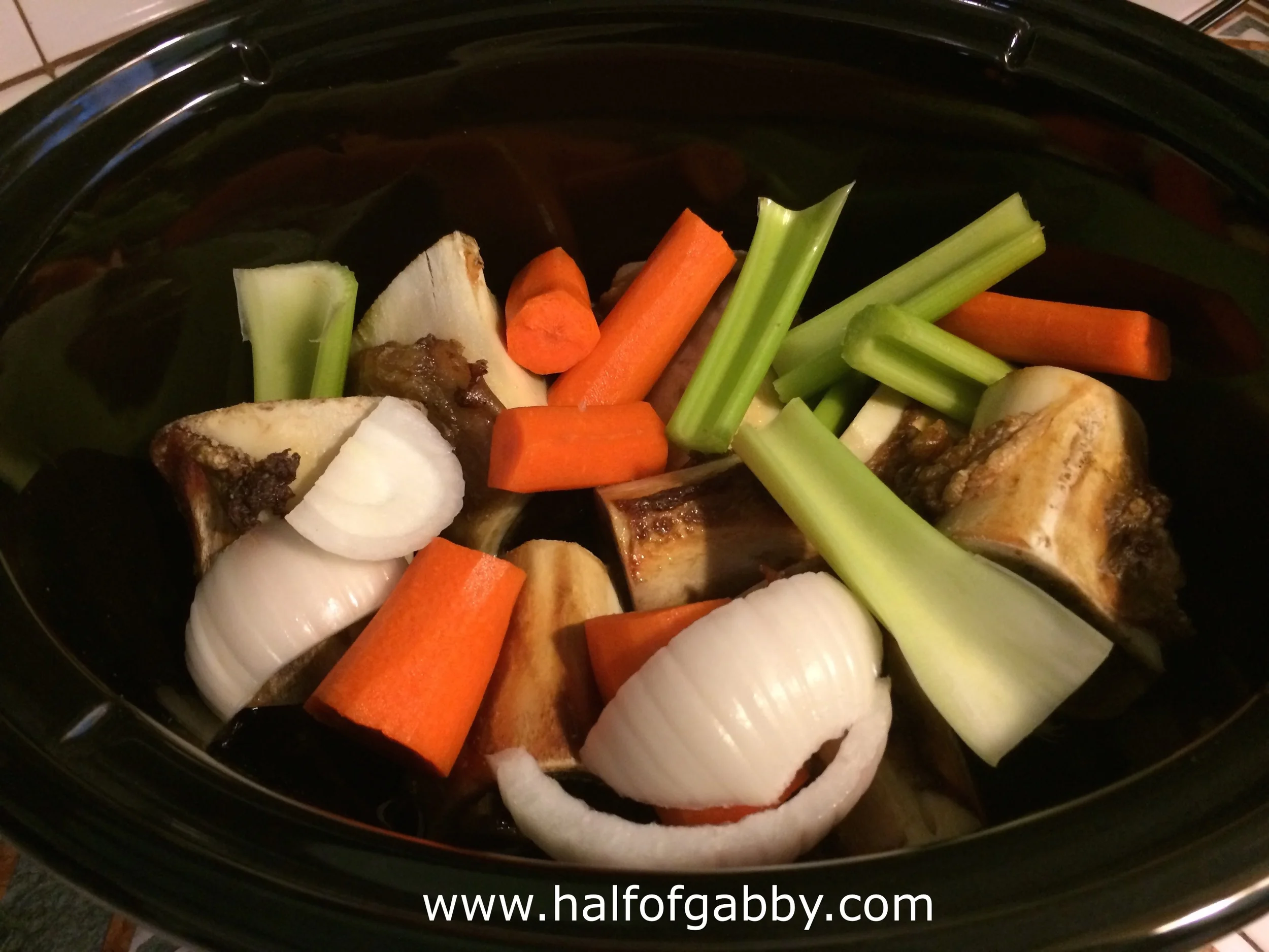 2. Lay roasted bones in the crockpot and then throw in all other ingredients except for the water and vinegar.