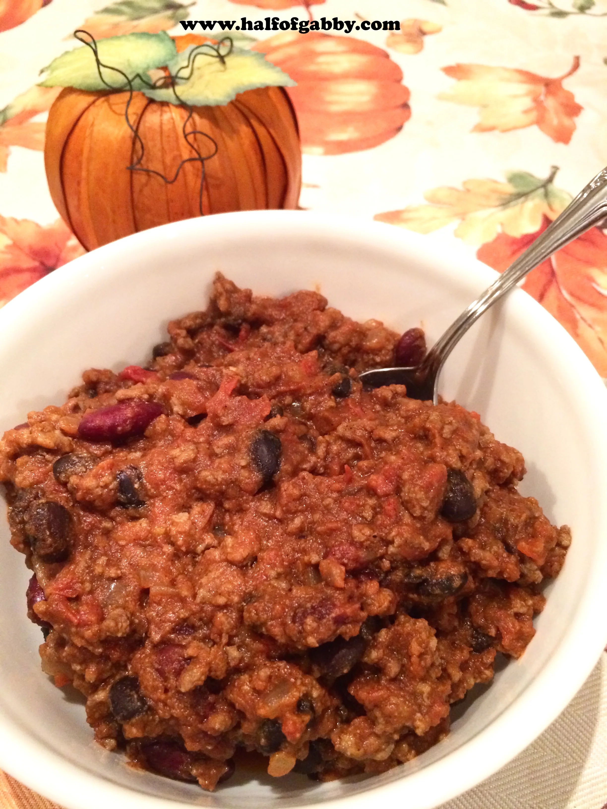 When I told him we were having pumpkin chili, his reply was this (while rolling his eyes), "Gab, don't you think you're taking this pumpkin thing a little too far. Pumpkin chili? Are you serious?"