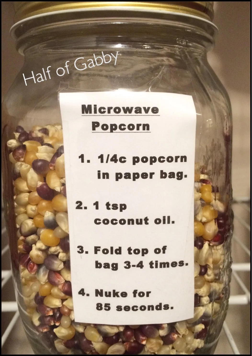 I made a healthy popcorn bar on one of our pantry shelves so that my girls (9 and 12) can make their very own SAFE microwavable popcorn. They love it! They make popcorn every single day and when they have friends over, they teach them how to make it too!