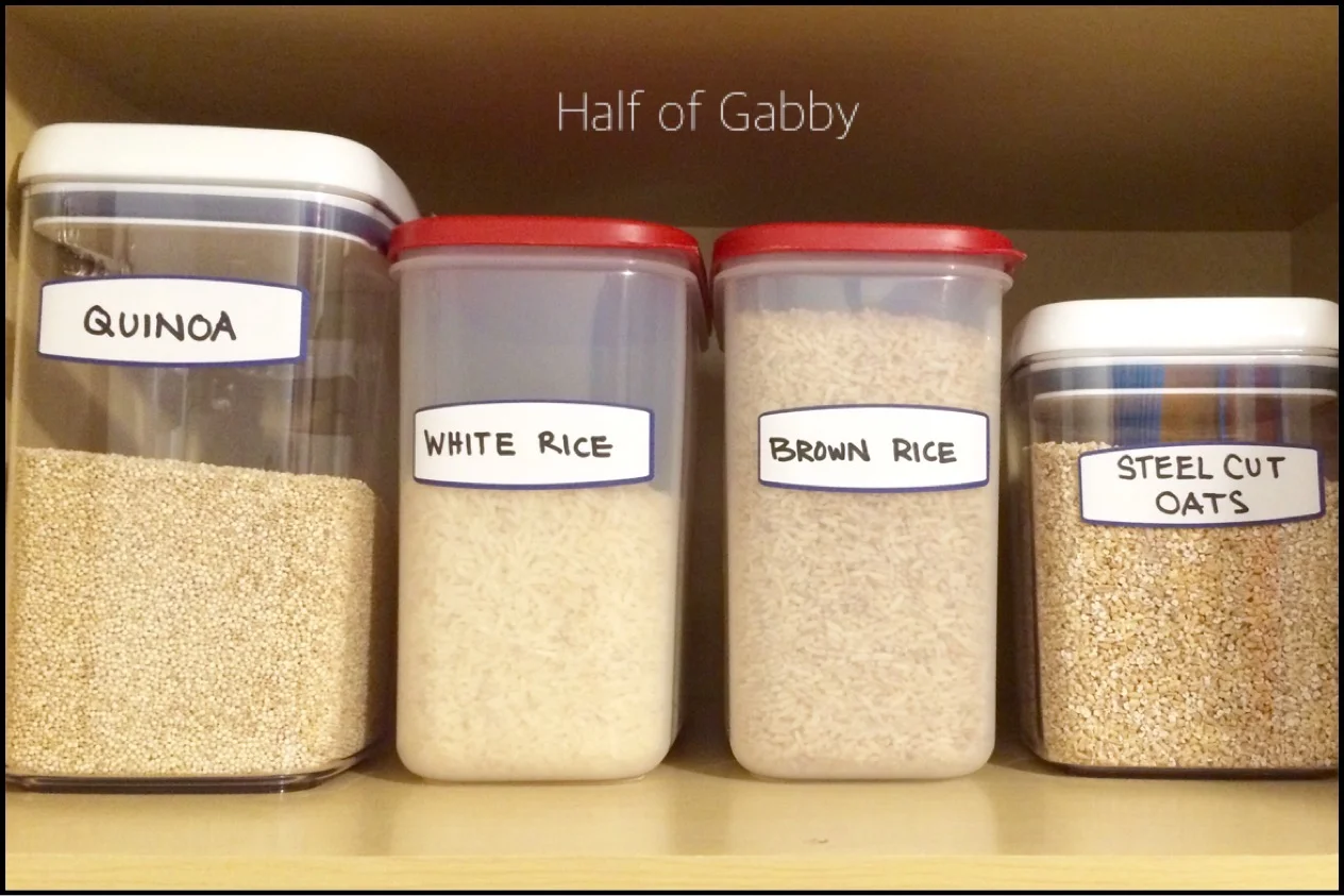 This keeps your foods and ingredients fresh longer AND it makes them easy to locate. You can use containers, boxes, and jars that you already have or you can buy some new containers to help you organize more neatly.