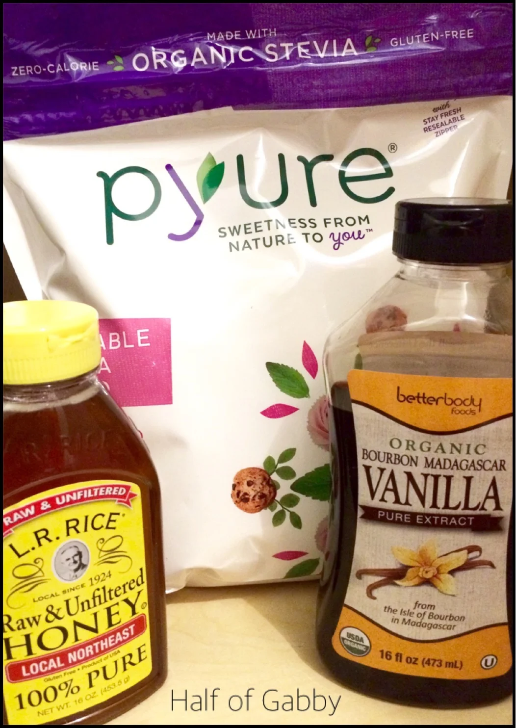 In addition to baking stevia, I will sometimes also use pure honey and organic vanilla to help sweeten up some recipes.