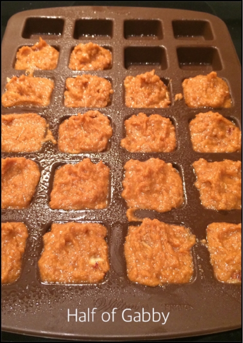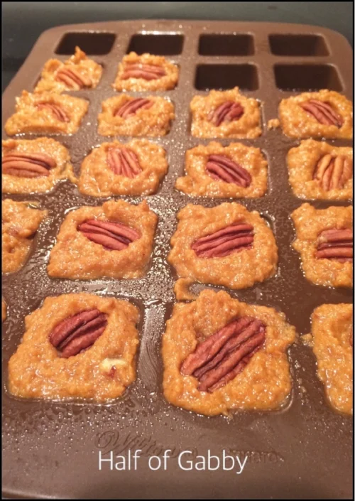 4. If using an 8 x 8 pan, place your pecan halvess in the middle of your imaginary squares by eyeballing it. If you're using a mold, simply plop the pecan in the middle of the square.