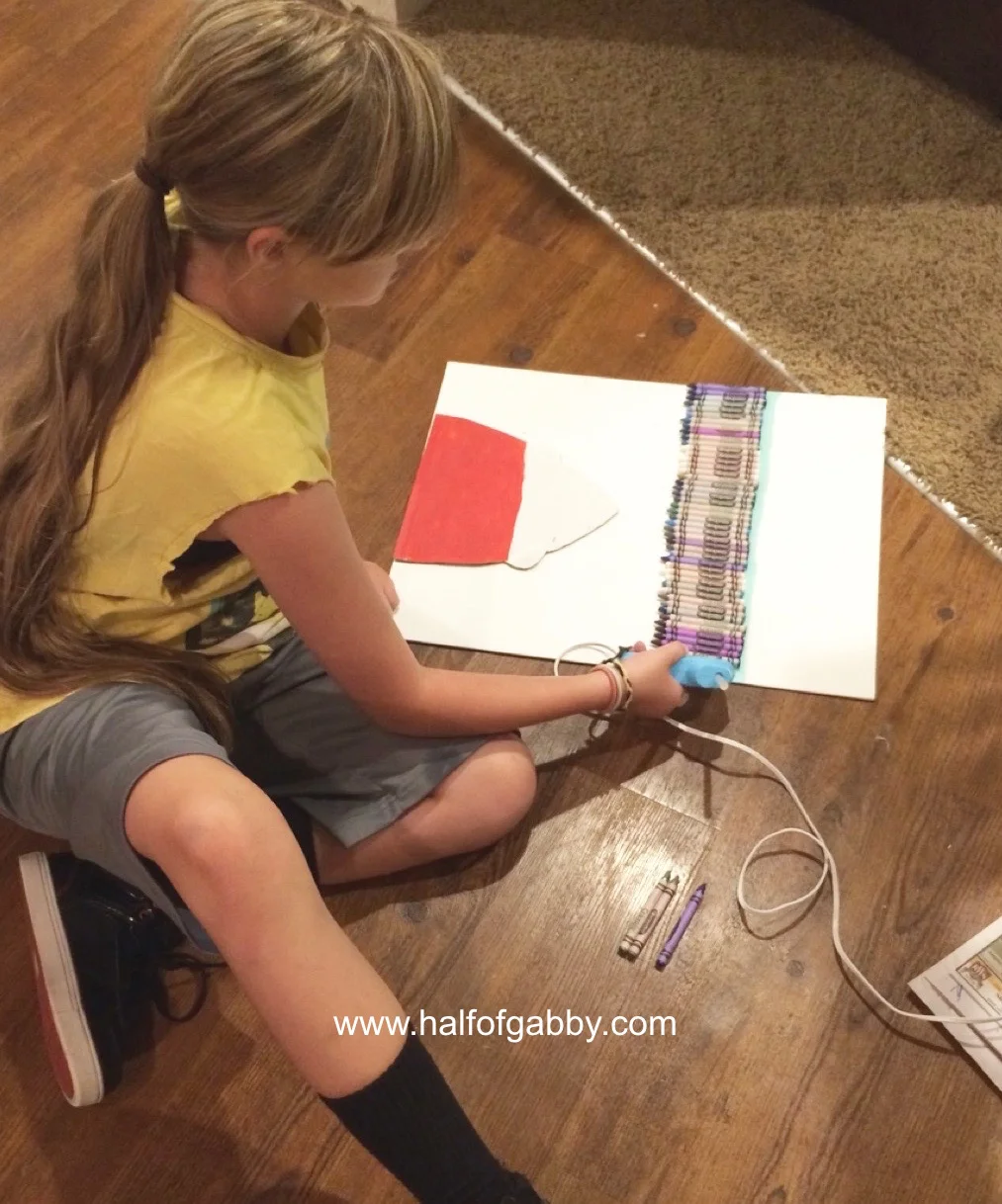 Now before you render me Mommy Dearest for letting my child handle a glue gun, let me explain that I have worked on dozens and dozens of projects with Jossy using a glue gun and I have closely supervised her while using one many times before. So I felt confident that she could handle this project on her own. I was in the same room as her but I was not supervising her closely. I was busy going between writing an article and doing laundry (which was still in eyeshot of her).
