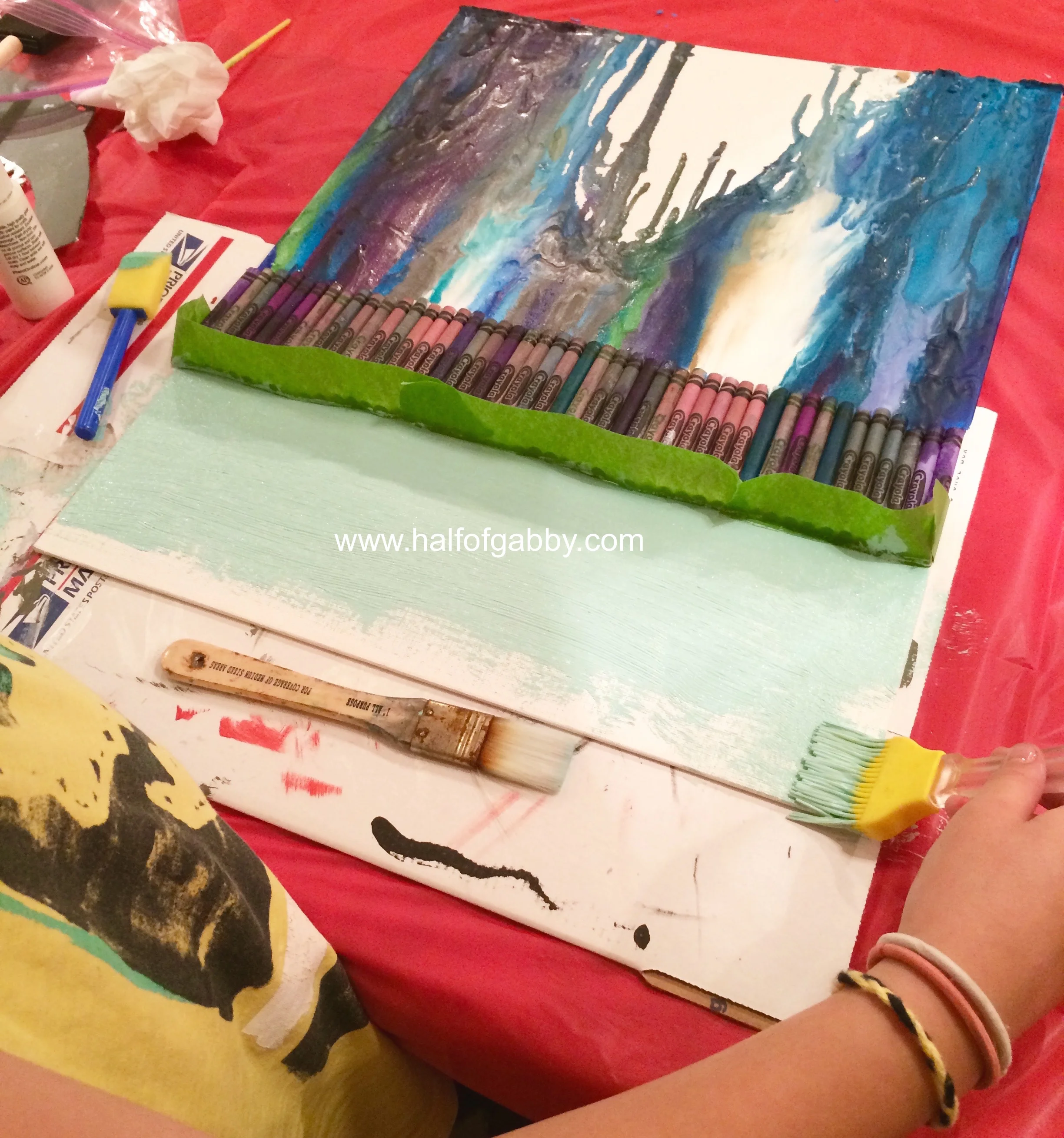 You will need to go back and forth between low and high settings to get the hang of it. After a few minutes, you'll start to get a feel for how the crayons respond to the heat. You can do as little or as much melting as your little heart desires. Jossy wanted it to look like solid ocean water so she kept going until every bit of the canvas was covered in melted wax. But you can do it however you want!