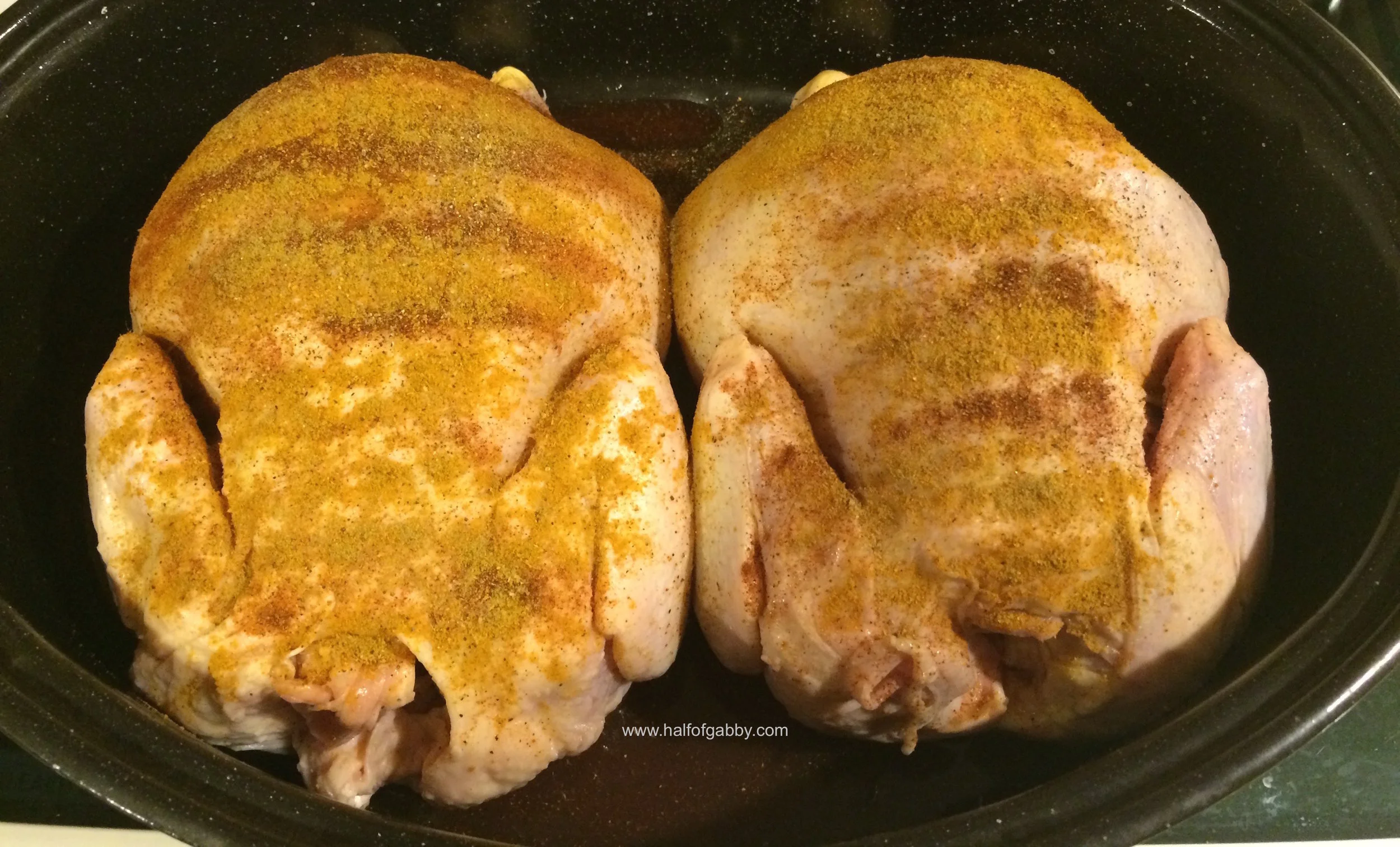 1. Put both of your chickens in a roaster side by side. Sprinkle the top of the chickens with Himalayan salt, pepper, and turmeric. If you don't have turmeric, sprinkle garlic salt or garlic powder instead.