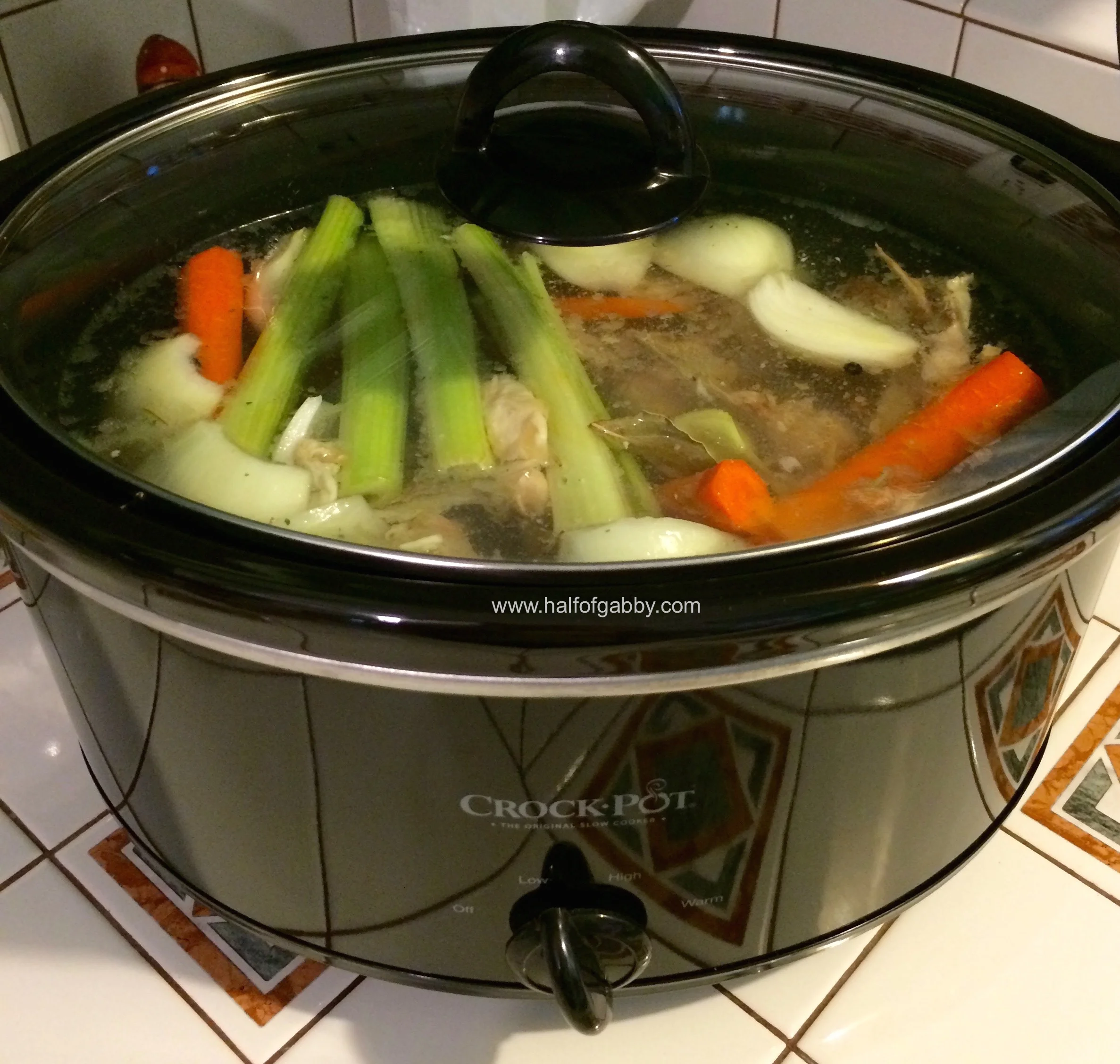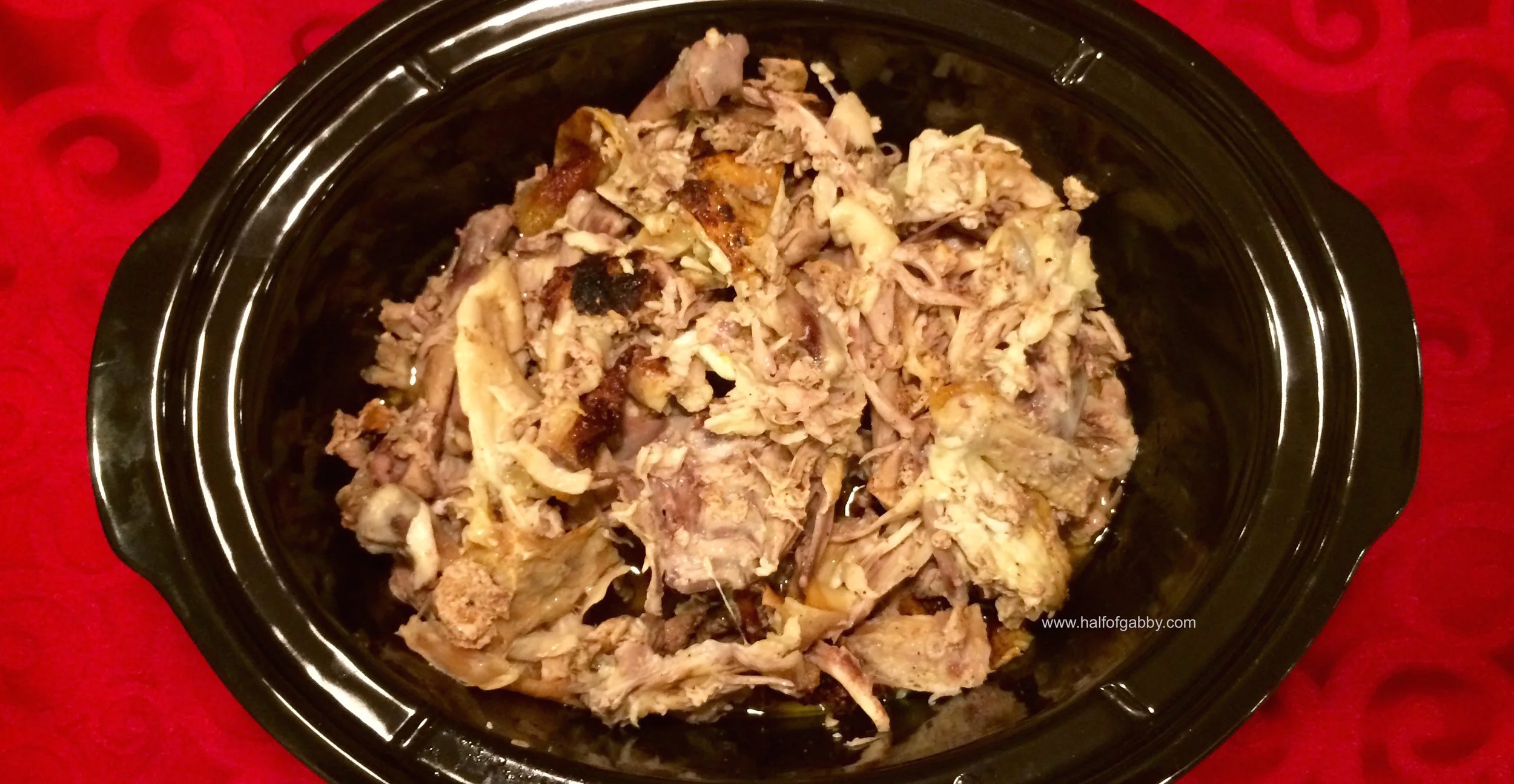 2. Take EVERYTHING leftover from the carcasses and put it in a crockpot. ALL of the bones, juice, skin, and fat. Everything!