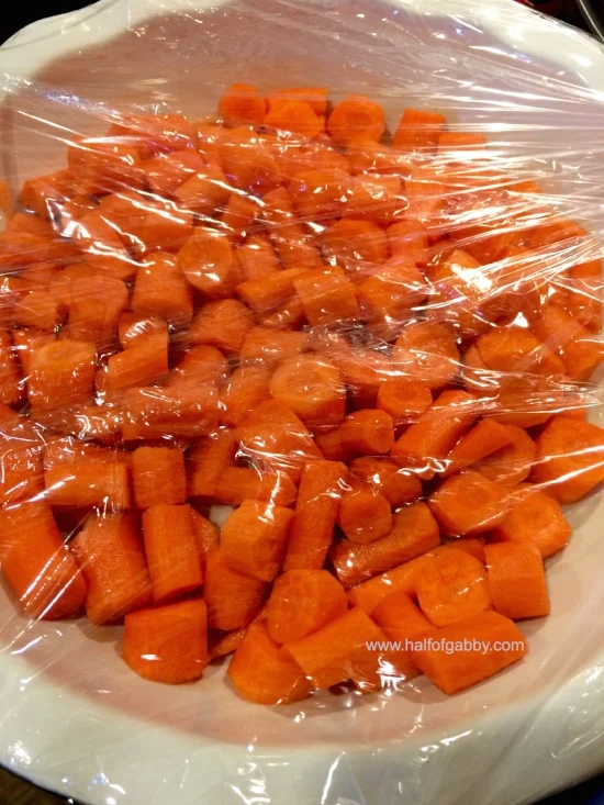 1. Peel and cut carrots, put in microwavable baking dish, and sprinkle with water. Cover with Saran and set aside.