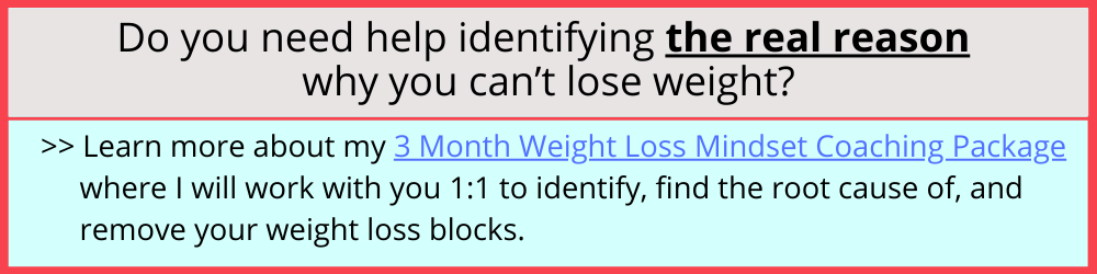 My specialty is removing weight loss blocks. You can learn more about how we would work 1:1 together to remove your block here: 3 Month Weight Loss Mindset Coaching Package.